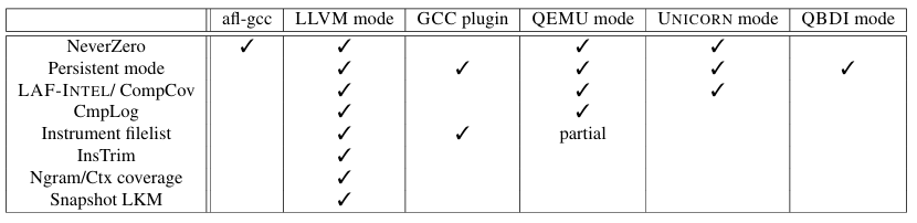 除了旧的afl-gcc封装外,afl++还提供了一个gcc插件。它包括对延迟初始化和持久模式的支持,如AFL LLVM模式。支持的功能与LLVM不一样,但AFL++正在计划提供其他功能,目标是实现功能的均等。