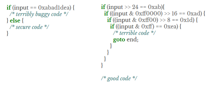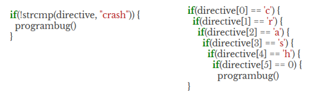 对于左图这样的代码,只有当变量input的值等于0xabad1dea时,才会执行bug代码。每当AFL生成一个不符合的输入,都不会使覆盖率产生变化,即使输入是几乎正确的0xabad1deb,也不会产生有作用的反馈。