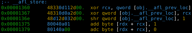 __afl_store代码段将代表该桩的随机数rcx与上一个桩的随机数__afl_prev_loc异或运算存入rcx,当前桩的随机数右移1位(目的是对于A->B、B->A这种情况,可以将A->B和B->A区分出来)赋值到新的__afl_prev_loc,*[__afl_area_ptr+rcx]是在位图中将该边的计数加0x01。adc指令将CF上的进位值也相加,达到NeverZero的目的。