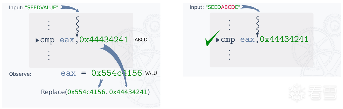 I2S关联的例子如下图所示。对cmp指令进行hook,运行指令时可以观察到eax的值为VALU,0x44434241则为ABCD(均为小端序)。