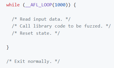 使用宏定义__AFL_LOOP(NUM)来决定单进程处理多少测试用例。需要注意的是每次fuzz过程都会改变一些进程或线程的状态变量,因此,在复用这个fuzz子进程的时候需要将这些变量恢复成初始状态。
