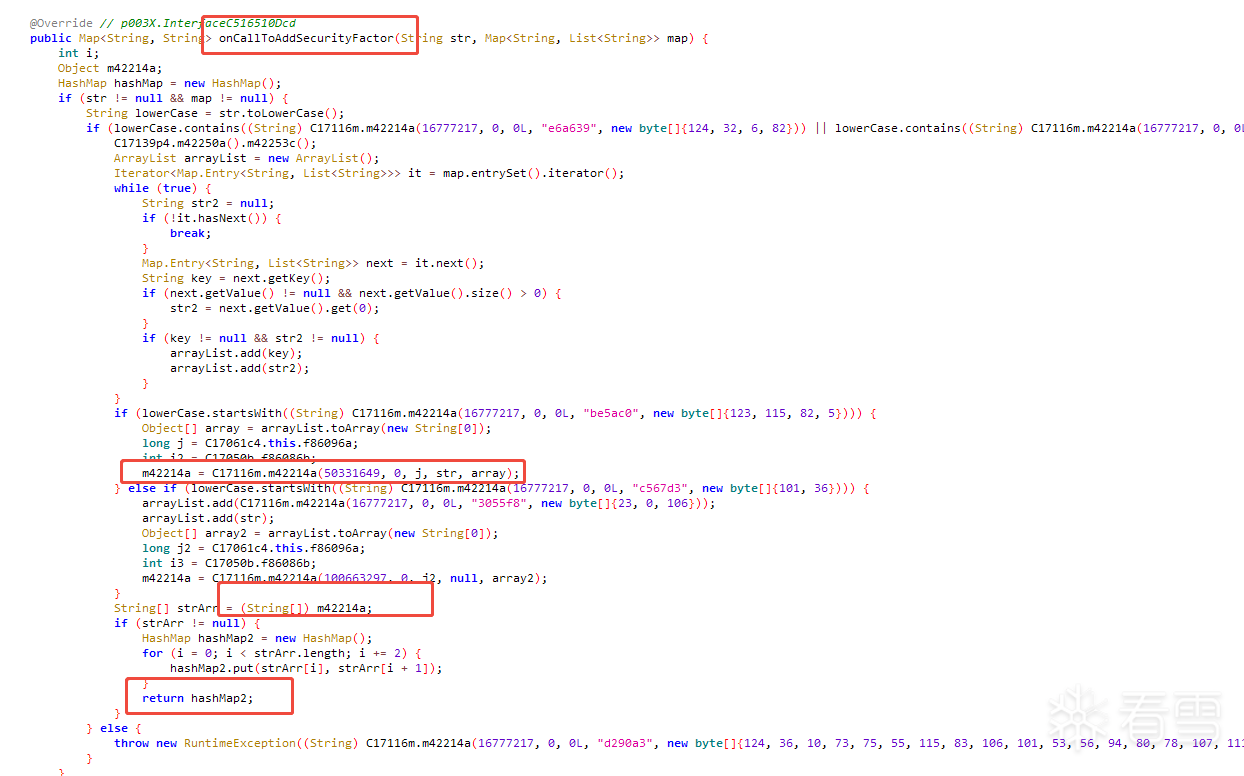 - 只看关键代码,里面又调了其他的方法,这个方法是native方法 c写的,开始找so文件