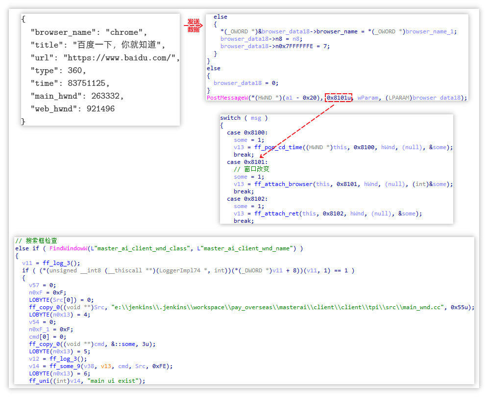 接收浏览器消息:每次切换至浏览器窗口时,BrowserBasic.tpi 会将数据传输至 master_ai_ext.tpi 模块。该数据随后被封装为 0x8001 消息发送至主窗口处理函数,随后利用 FindWindowW 寻找类名为 master_ai_client_wnd_class,窗口名为 master_ai_client_wnd_name 的窗口,以检查是否已存在对应搜索框。