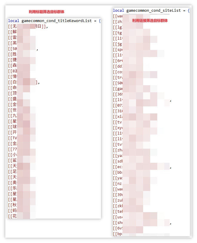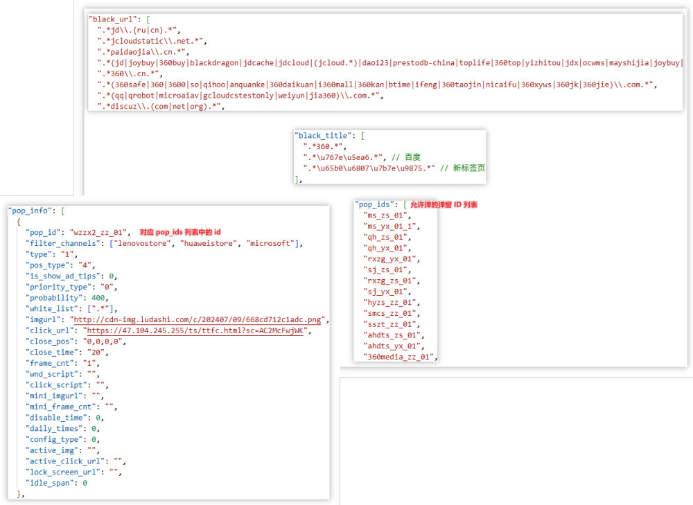 下图为云控配置中出现的 black_url 与 black_title 字段,根据其命名及所列网址和标题内容,推测是禁止弹窗的页面。且云控配置中的 pop_ids 为允许弹窗的ID列表,与 pop_info 中的 pop_id 相对应。