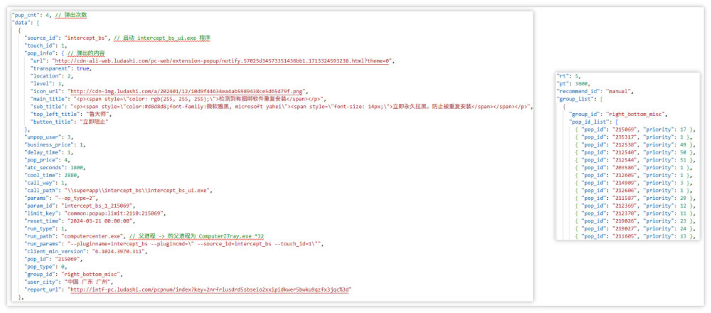 本次主要围绕鲁大师软件展开技术分析,并提出该系列推广软件的共性。在溯源过程中,我们发现小鸟壁纸等软件同样包含类似的推广模块,其中Lua脚本执行模块和云控配置请求模块是这些带有推广插件的软件的共同特征。