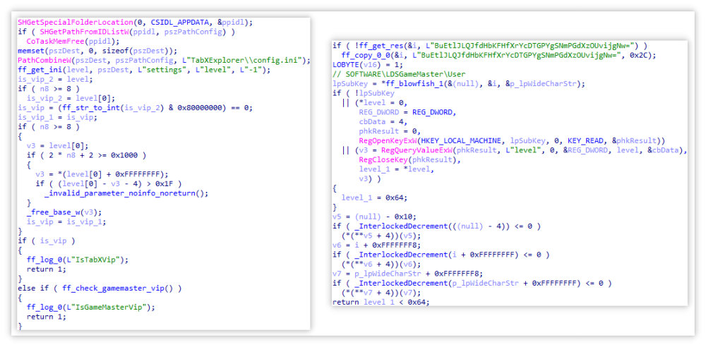 VIP数据通过读取本地配置文件或注册表获取。例如,检测 %APPDATA%\TabXExplorer\config.ini 文件中 settings 节的 level 值是否大于等于0,或检测注册表项 HKEY_LOCAL_MACHINE\SOFTWARE\LDSGameMaster\User 中 level 键值是否存在且小于100。