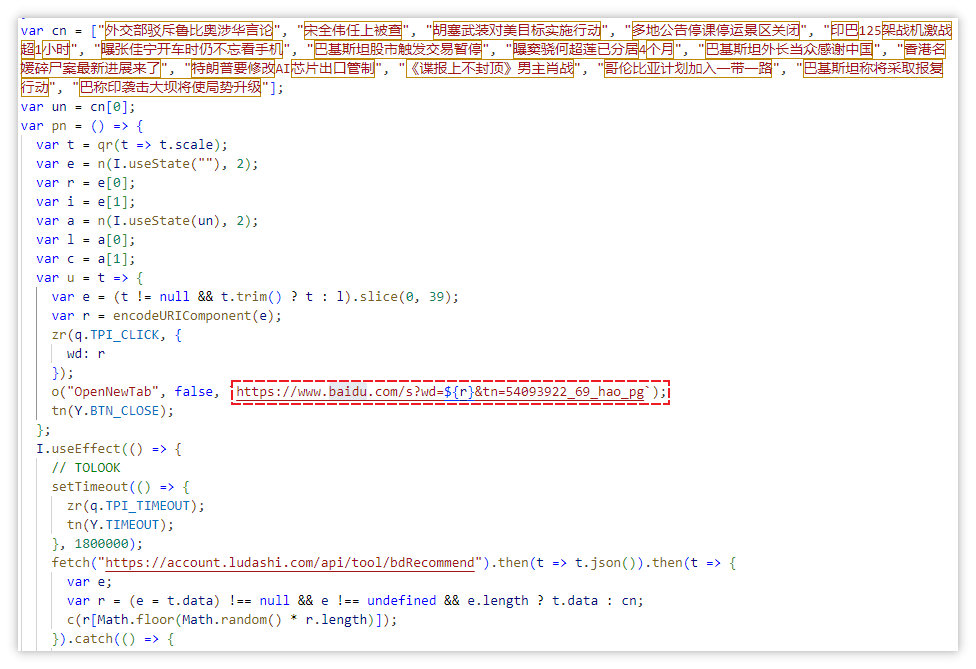 根据测试中获取到的云控配置,推广模块会进行多种流量劫持操作。例如,识别到用户访问京东链接时会额外跳转至红包领取页面以获取推广佣金;识别百度搜索链接时会在URL中添加 tn 渠道标识参数以获取搜索推广分成;以及其他类似的流量劫持变现行为。