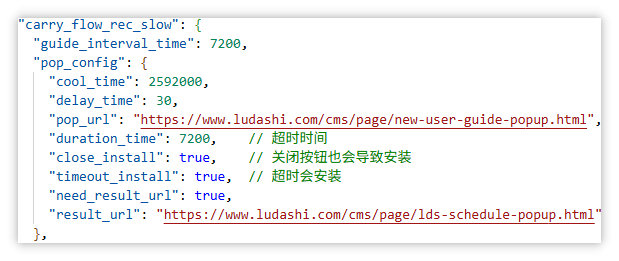 云控配置:下图为整体云控配置中的弹窗安装相关配置,其中包含 close_install、timeout_install 之类的安装开关,分别为是否允许点击关闭按钮安装和超时安装。