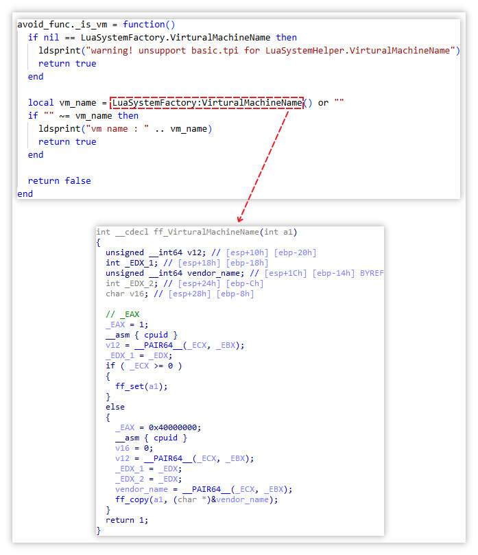 在规避虚拟机环境时,推广模块会调用 Basic.tpi(Lua 解释模块)中的 LuaSystemFactory.VirturalMachineName 函数进行检测。该函数通过 CPUID 指令实现虚拟机识别:首先传入 EAX=1,检查返回值的第 31 位是否为 1,若为 1 则表明运行在 Hypervisor(虚拟机监控程序)环境中;随后传入 EAX=0x40000000 读取虚拟机厂商标识,从而精确识别虚拟机类型。