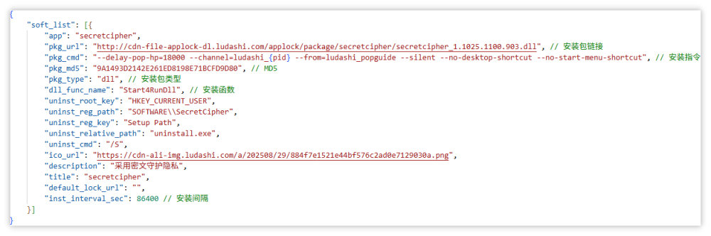 安装前先随机选择目标软件,并下载该安装包(动态链接库)并调用导出函数 Start4RunDll,以实现安装。安装时会附加静默参数 --delay-pop-hp=18000 --channel=ludashi_ludashi --from=ludashi_popguide --silent --no-desktop-shortcut --no-start-menu-shortcut,此时安装是静默的、没有托盘图标、开始菜单、桌面快捷方式等显式安装效果。
