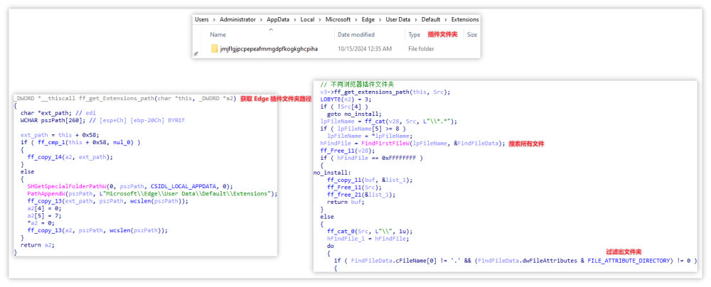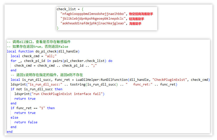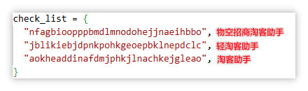 其中浏览器插件的检测是通过脚本中插件清理模块(bp_clean)中的 CheckPluginExist 函数进行检测,其中原理是遍历上述浏览器支持列表中所有 extensions 插件文件夹,检测其中是否有指定插件 ID,本次所规避的是淘客助手类浏览器插件(aokheaddinafdmjphkjlnachkejgleao)。