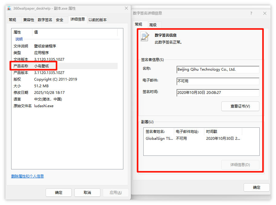 而其中一款产品名称标注为"小鸟壁纸"的可执行程序显示"Beijing Qihu Technology Co., Ltd."公司的有效签名。