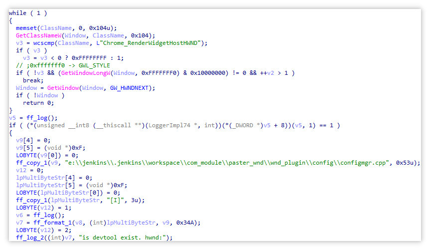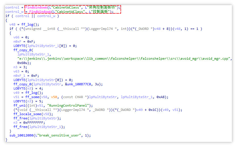 系统通过检测窗口类名来识别控制面板并进行规避。该窗口检测逻辑与 DirectX 强力修复软件中的 wsadd.pln 模块实现方式一致。(文章《流氓联盟欺软怕硬,多链路恶意推广》中检测控制面板窗口的逻辑,相关链接见文末。)