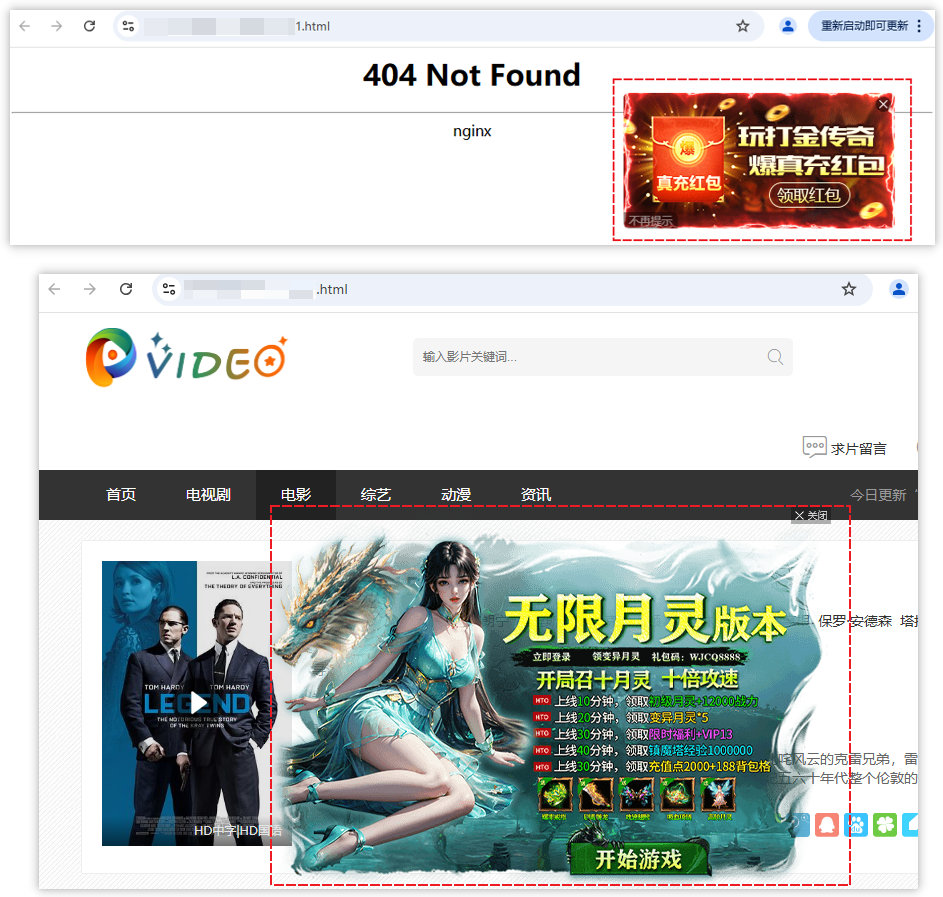 2.根据云控配置浏览器弹出百度搜索框与"传奇"页游框: