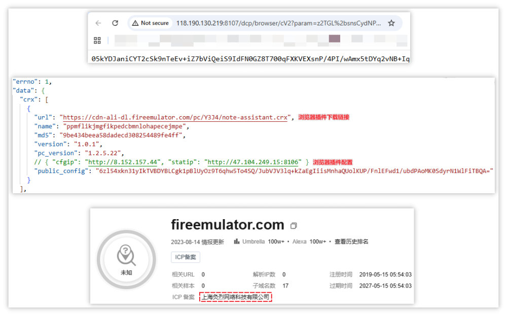 随后发送112K9s2c8@1M7q4)9K6b7g2)9J5c8W2)9J5c8U0p5I4z5q4)9J5k6e0p5&6x3q4)9J5k6e0p5K6x3q4)9J5k6e0t1I4z5g2)9K6b7e0R3I4x3o6N6Q4x3V1k6V1j5%4m8Q4x3V1k6T1M7X3!0%4M7$3g2J5i4K6u0r3j5#2j5J5i4K6y4r3M7r3q4J5j5h3#2Q4x3@1c8Q4c8e0g2Q4z5p5q4Q4b7e0m8Q4c8e0g2Q4b7f1k6Q4z5o6k6Q4x3U0S2Q4y4@1u0Q4x3U0k6I4N6h3!0@1i4K6y4n7K9g2)9J5y4Y4q4#2L8%4c8Q4x3@1u0Q4x3@1q4Q4x3U0k6I4N6h3!0@1i4K6y4n7y4U0m8p5x3U0V1^5y4p5k6Q4x3X3b7@1z5o6N6r3i4K6u0V1y4o6t1&6k6q4)9J5k6p5t1K6c8U0S2Q4x3X3b7$3x3V1f1%4y4U0l9K6x3o6j5&6z5f1g2Q4x3U0k6I4N6h3!0@1i4K6y4n7i4K6u0o6i4K6t1$3M7i4g2G2N6q4)9K6b7Y4m8Q4x3U0k6I4N6h3!0@1i4K6y4n7i4K6y4m8i4K6t1$3M7i4g2G2N6q4)9K6b7R3`.`.hvsLi6Wy","s":0,"t":1762314116,"v":"1.2.5.22"}) 获取插件数据,其中字段 p 的值决定所获取的云控配置,当值为 hvsLi6Wy 时,返回数据中插件下载地址所属域名的备案信息为“上海灸烈网络科技有限公司”。
