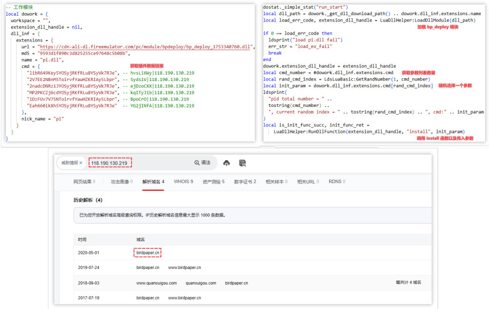 该类样本具备下载并加载任意DLL的能力。本次发现的云控配置即利用该功能分发浏览器插件安装模块,目前仅在鲁大师环境中观测到此类脚本。