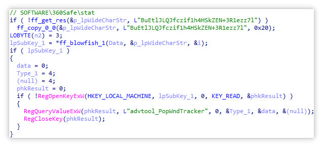 检测 HKEY_LOCAL_MACHINE\SOFTWARE\WOW6432Node\360Safe\stat 项中 noadpop 与 advtool_PopWndTracker 的键值是否为 1,后者的值表明是否开启 360 弹窗过滤器的强力模式。