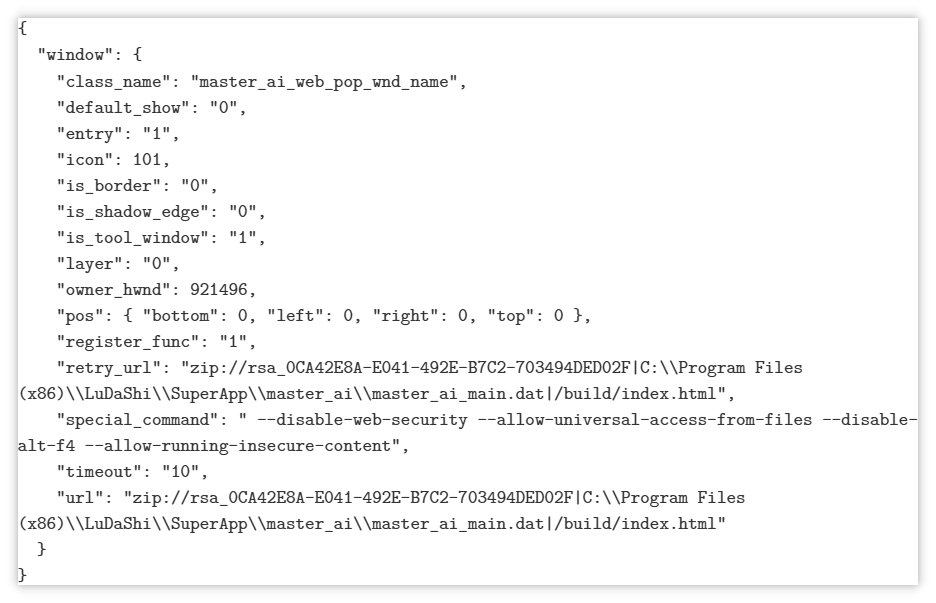 最终会调用 "C:\Program Files (x86)\LuDaShi\SuperApp\master_ai\master_ai_main.exe" --pop_type=attach_opened_doc --attach_wnd=921496 以实现指定窗口弹出搜索框的操作。其调用 js_basic.dll 时,会传入 JSON 数据,从该数据可以看出,将会加载 master_ai_main.dat 文件中的 index.html。