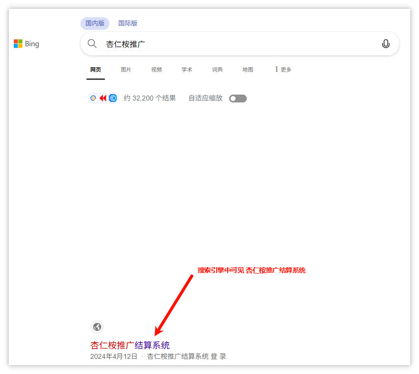 例如在必应搜索引擎中搜索"杏仁桉推广"关键词,可以查询到【1.2】小节中的杏仁桉推广结算系统。