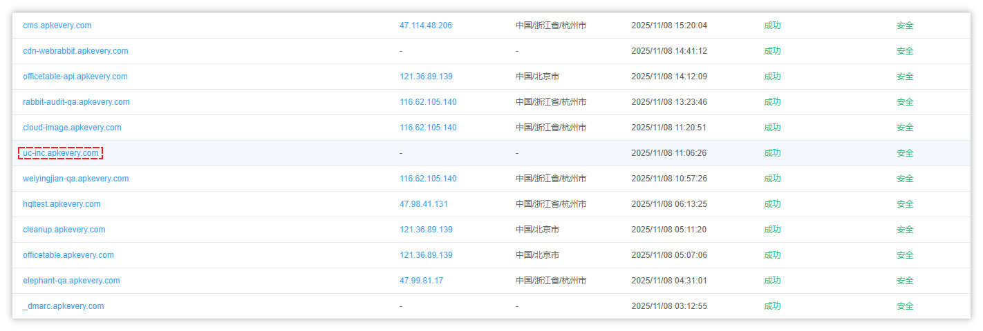 在收集本次威胁情报相关信息的过程中,我们发现了一系列相关的网络活动痕迹。其中,围绕"天津杏仁桉科技有限公司及其域名"apkevery.com",产生了大量网络活跃数据。