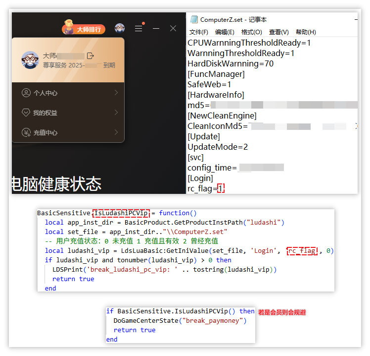 除了云控请求时会附带会员状态,在部分 Lua 脚本中也会检测是否为会员或充值,若充值过鲁大师尊享版会员则会在配置文件 ComputerZ.set 中设置 rc_flag 键值为 1,随后在 Lua 脚本中检测会员状态从而规避。