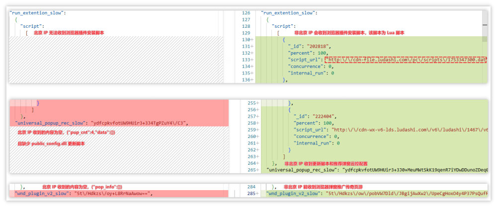 云控配置包含大量推广相关参数。通过测试发现,非北京IP与北京IP获取到的配置存在显著差异,通常非北京IP会收到更多的推广配置,具体对比如下所示。