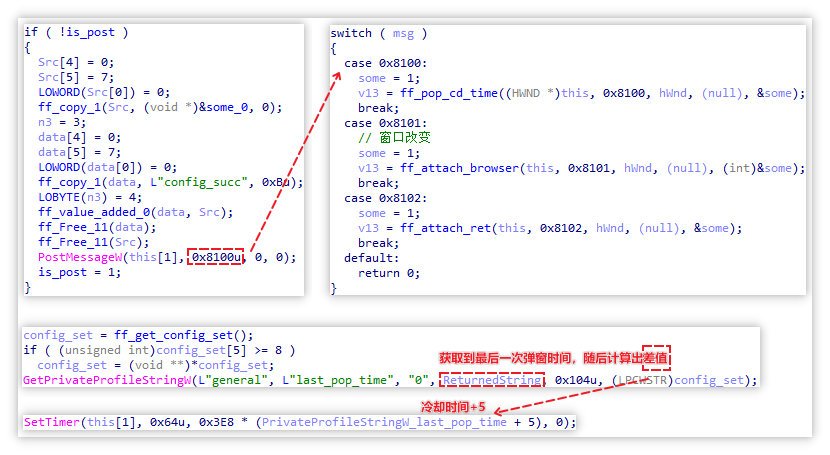 云控配置触发冷却时间检测:从 ConfigCenter 获取到云控配置后,其会发送 0x8100 消息以触发检测冷却时间,随后通过 SetTimer 设置 ID 为 0x64 的计时器等待冷却结束,最后执行环境规避检测。