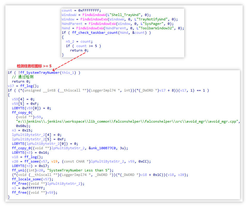 系统会检测任务栏图标数量是否大于等于5个,以此规避常驻进程较少的测试环境或虚假用户。