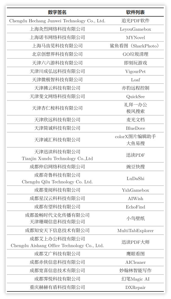 在火绒安全情报系统中,我们通过建立规则的方式收集与本次威胁情报相关的样本关键信息。根据样本关键信息从样本库中提取相应的样本以及其来源,我们获得了大量使用本次威胁情报中涉及到的推广模块的数字签名信息,从样本数字签名中提取的详细信息中,可以获得与本次威胁情报相关的大量厂商名称,从而得到【1.1】小节中的软件列表图。