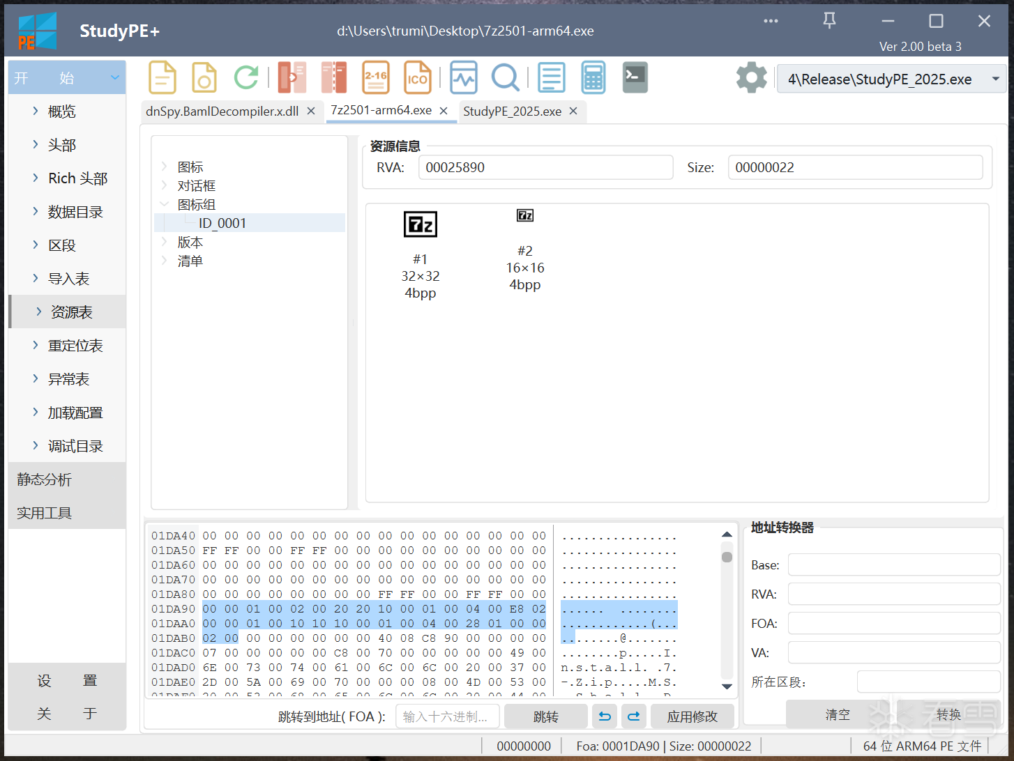 QT 6 已经不支持WIn7了。。。使用win7的请继续使用1.11版StudyPE+ (x86) / (x64) [ PE32 & PE64 查看/分析集成工具]【软件说明】主要功能: ■基于 Qt 框架重构,支持 High-DPI 及多标签页操作。 ■采用懒加载技术,秒开大文件,PE大小无限制。 ■支持 PE32/64、ARM/ARM64 及 .NET 架构。 ■内置 Detect It Easy (DIE) 查壳引擎。 ■支持解析异常表、重定位表、Load Config、Rich Header 及 .NET 元数据。 ■提供可视化的区段操作(新增/删除/合并/偏移修正)。 ■支持导出表、TLS 回调处理、附加数据的多种数据操作。 ■支持解析资源段,支持图标、位图、菜单、字符串表及 Manifest 预览。 ■集成 Capstone 引擎,支持汇编代码与二进制差异对比。 ■提供 特征码 (Pattern)、汇编指令及高性能字符串搜索。 ■内置进程管理器,支持查看模块列表、内存区域映射与转存。 ■内置 Hex 编辑器 (视图联动)。 ■集成 RSA 、大数进制转换、Hash/HMAC 计算及 Base64 编解码工具箱。 ■支持 RVA/FOA/VA 地址转换。 ■深色/浅色主题切换及简/繁/英多语言界面。