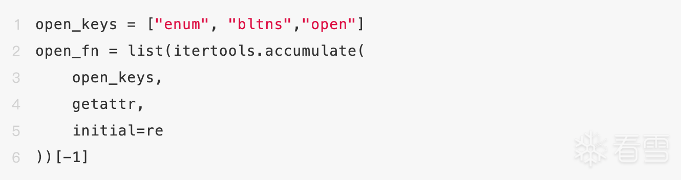 首先,我们可以利用函数动态链接调用的方法来绕过模块白名单的检查。具体代码如下,从re模块开始,通过getattr()得到open_keys中的属性,最终程序实现的方法为<built-in function open>,即绕过沙箱环境限制获得builtins模块,方法open()。