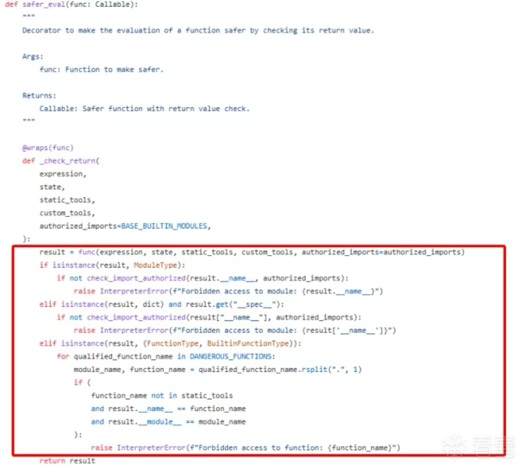 对执行表达式的主函数用 safer_eval 装饰器包裹,返回之前做上述检查。只要返回值涉及未授权模块或危险函数,立即阻断执行。
