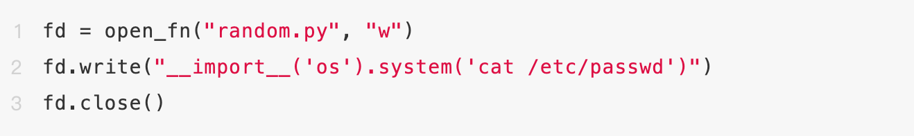 之后我们利用该方法实现在根目录下创建一个random.py文件,也可能是其他文件,但是文件名需要符合模块白名单,后面会用到。同时需要在random.py文件中写入恶意代码。
