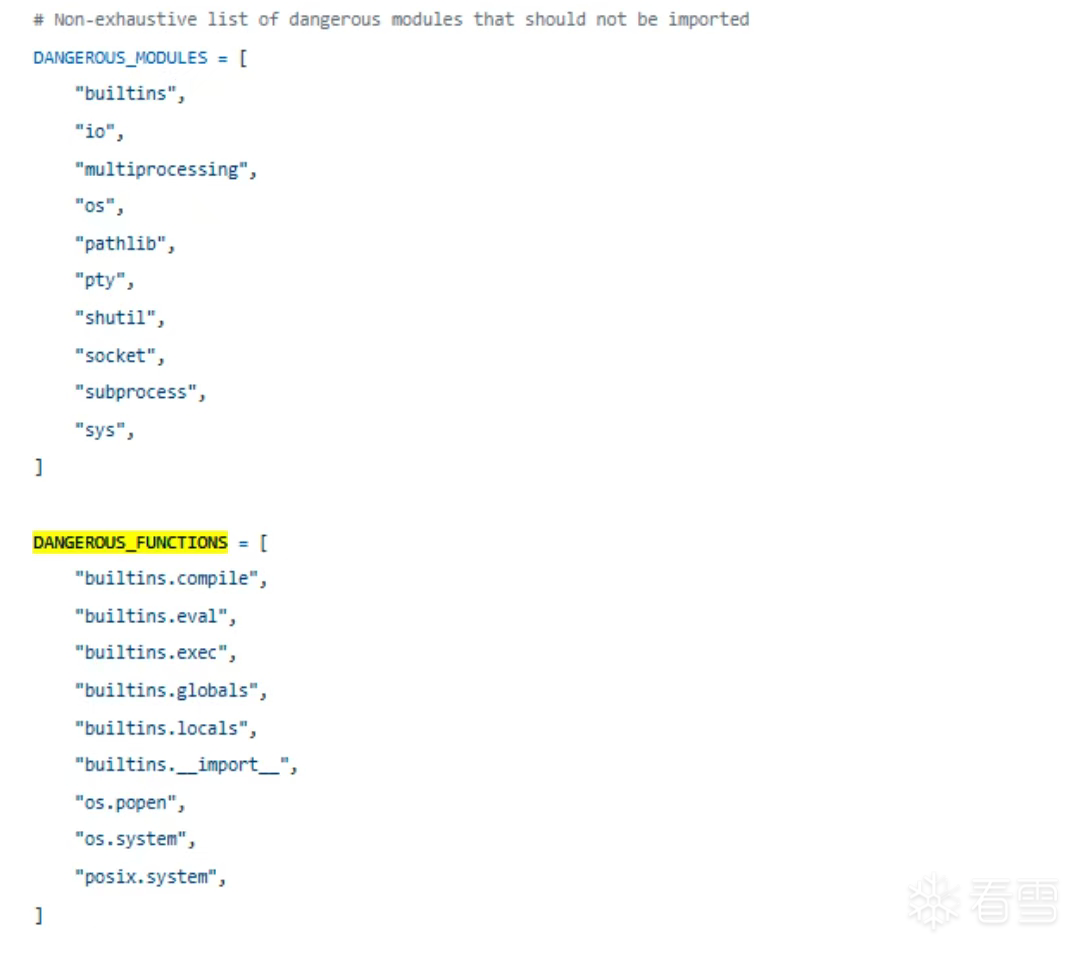 如果程序返回的值是一个函数,则会启用内置函数检查来判断是否存在危险函数和未授权模块的访问。具体的内置函数和模块如下。