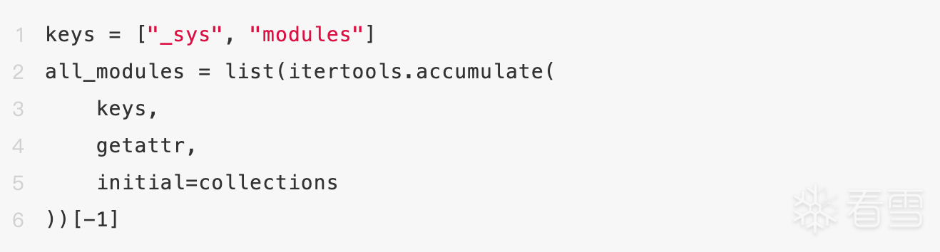 再次重复前面的逻辑绕过模块白名单的检查,具体代码如下,从collections开始,实现间接访问内置函数检查的sys.modules模块。