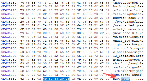 /app/bin目录下的内容很显眼,多关注下,有telnet_server?现在不知道用户密码,tftpupg可能是升级时用的,猜测mic是正常启动时第一个开的app,日志中开始有这个出现。去固件中查找mic 相关的字符串,找到类似开机脚本类的