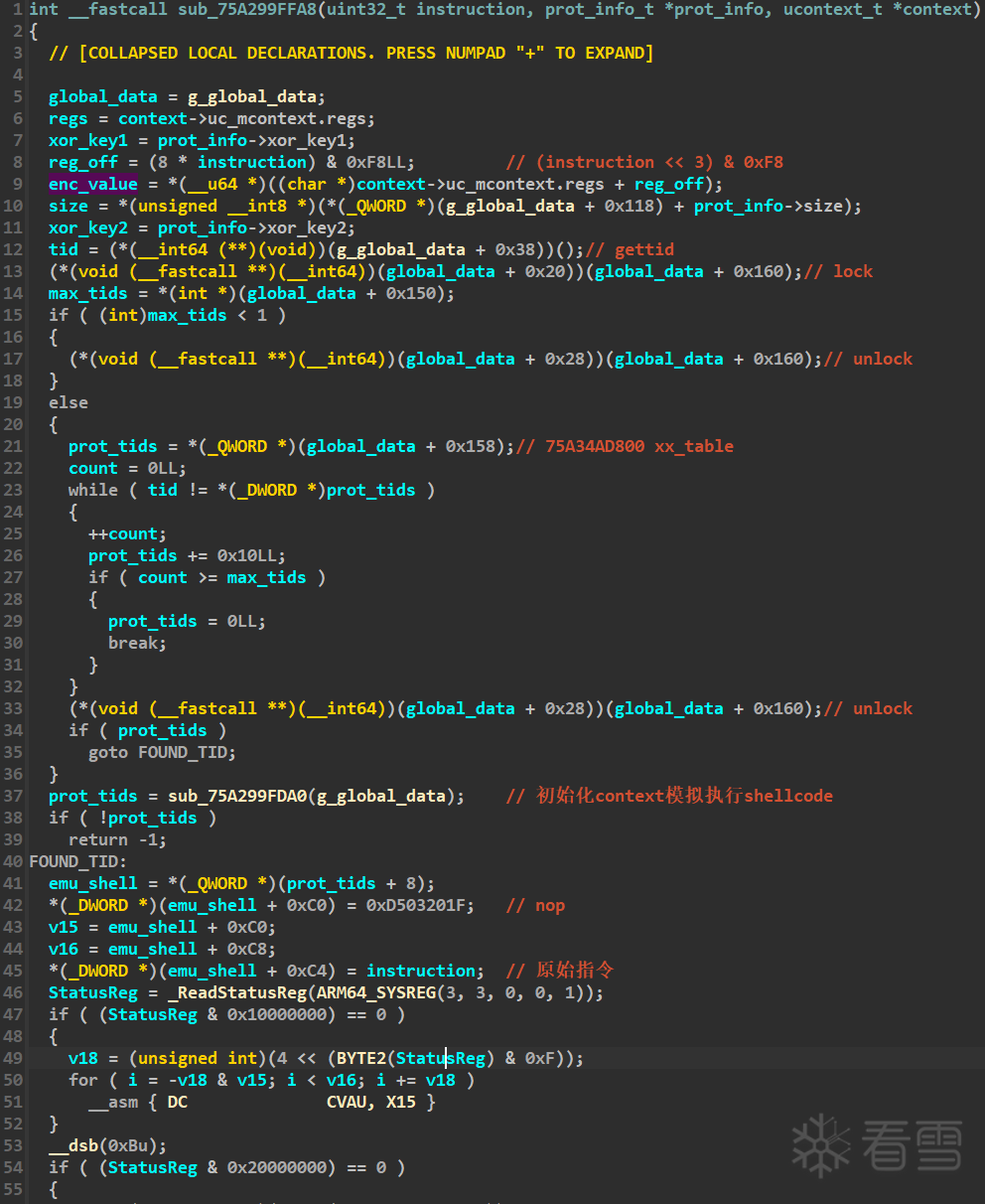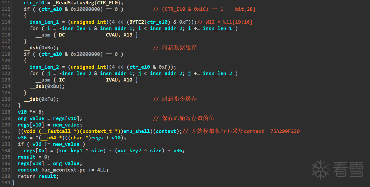 与直接读写内存的指令类似,解析指令拿到指令隐性使用到的寄存器值,解密值并将其写回context,随后直接模拟执行来修正异常指令执行后的context并跳过该指令