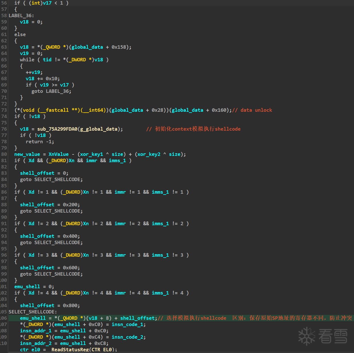 代码预置了四个类似的shellcode,唯一区别是解析shellcode参数时用到的寄存器分别为X0、X1、X2、X3,其目的是为了防止解析参数的寄存器影响到模拟执行结果