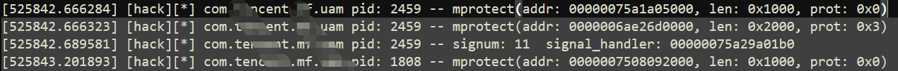 既然无法访问,那么进程自身是如何访问的呢?遂在内核接管了下 mprotect 和 sigaction,发现游戏设置了SIGSEGV (11) 的 signal_handler 用来处理内存访问异常