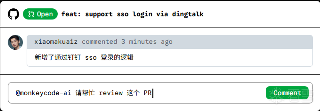 ● 在PR / MR中艾特@MonkeyCode,它会自动进行代码Review,提出改进建议。