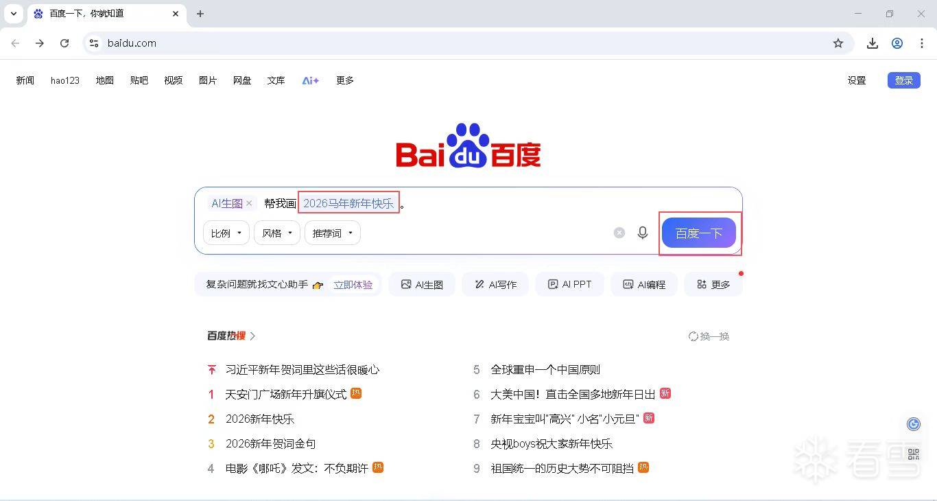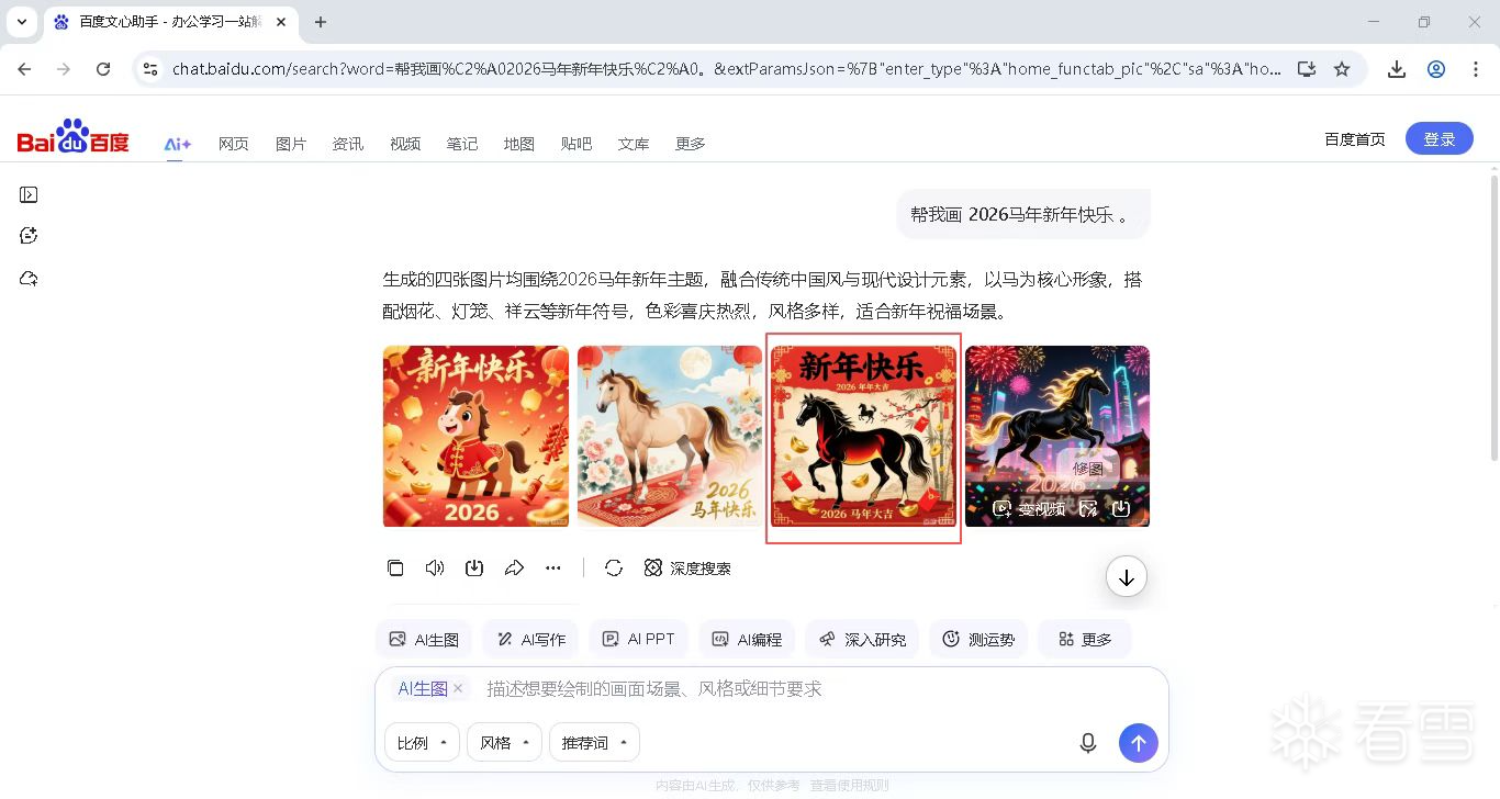 第二步:描述图片:点击AI生图后在描述框里输入图片描述比如2026马年新年快乐