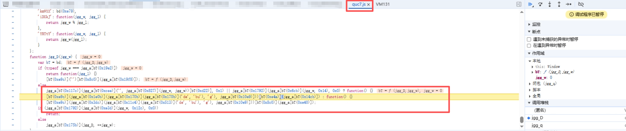 无限debugger总共出现了两次,第一次是在quc7.js文件,这是在进入网站的时候出现的debugger