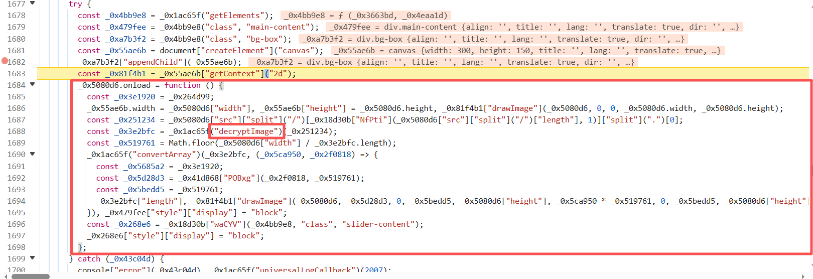 刷新图片,断点断下来了,可以很清晰的看到代码有个decryptImage,_0x5080d6.onload函数扣下来逐行分析