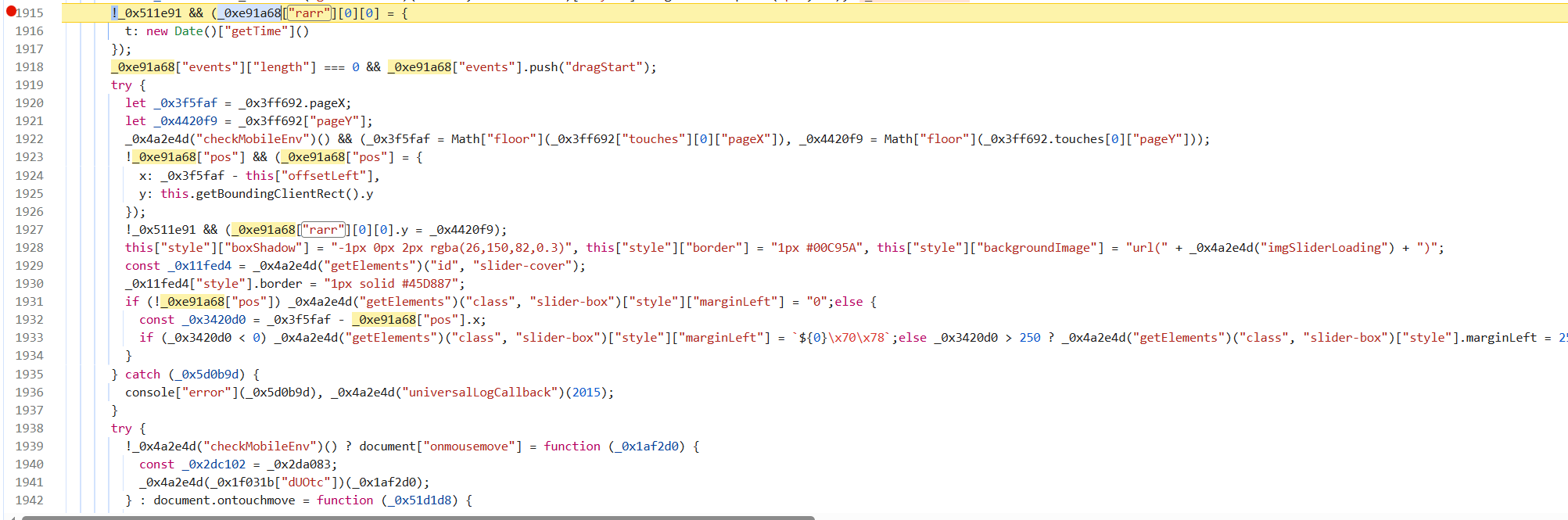 1 2 3 4 5 6 7 8 9 10 11 12 13 14 15 16 17 18 19 20 21 22 23 24 25 26 27 28 29 30 31 32 33 34 35 36 37 38 39 40 41 42 43 44 45 46 47 48 49 50 51 52 | try { // 获取鼠标的横坐标 pageX let _0x3f5faf = _0x3ff692.pageX; // 获取鼠标的纵坐标 pageY let _0x4420f9 = _0x3ff692["pageY"]; // 如果在移动端环境,则从 touches[0] 中读取 pageX 和 pageY,并向下取整 _0x4a2e4d("checkMobileEnv")() && ( _0x3f5faf = Math["floor"](_0x3ff692["touches"][0]["pageX"]), _0x4420f9 = Math["floor"](_0x3ff692.touches[0]["pageY"]) ); // 如果 pos 属性还没有赋值,则赋值为本次事件的起点坐标(减去滑块的左偏移获得鼠标相对于滑块的 X 坐标,Y 坐标用 getBoundingClientRect().y) !_0xe91a68["pos"] && (_0xe91a68["pos"] = { x: _0x3f5faf - this["offsetLeft"], y: this.getBoundingClientRect().y }); // 如果之前 marginLeft 不存在,则给 rarr[0][0] 对象加上 y 坐标,记录下拖动开始的位置 !_0x511e91 && (_0xe91a68["rarr"][0][0].y = _0x4420f9); // 给当前拖动对象设置样式:阴影、边框和 loading 背景图 this["style"]["boxShadow"] = "-1px 0px 2px rgba(26,150,82,0.3)"; this["style"]["border"] = "1px #00C95A"; this["style"]["backgroundImage"] = "url(" + _0x4a2e4d("imgSliderLoading") + ")"; // 获取 id 为 "slider-cover" 的元素,并设置其边框颜色 const _0x11fed4 = _0x4a2e4d("getElements")("id", "slider-cover"); _0x11fed4["style"].border = "1px solid #45D887"; // 如果 pos 还没有值,则将 slider-box 的 marginLeft 归零 if (!_0xe91a68["pos"]) { _0x4a2e4d("getElements")("class", "slider-box")["style"]["marginLeft"] = "0"; } else { // 计算当前鼠标/手指与初始点击点的横向距离 const _0x3420d0 = _0x3f5faf - _0xe91a68["pos"].x; // 如果小于 0,则 marginLeft 赋值为 0px(不允许向左拖动) if (_0x3420d0 < 0) { _0x4a2e4d("getElements")("class", "slider-box")["style"]["marginLeft"] = `${0}px`; } // 如果大于 250,则 marginLeft 赋值为 250px(最大滑动距离) else if (_0x3420d0 > 250) { _0x4a2e4d("getElements")("class", "slider-box")["style"].marginLeft = 250 + "px"; } // 如果是刚刚开始拖动,则 marginLeft 赋值为 0px else if (_0xe91a68.events[0] === "dragStart") { _0x4a2e4d("getElements")("class", "slider-box").style["marginLeft"] = 0 + "px"; } // 否则,将 marginLeft 设置为当前拖动距离 else { _0x4a2e4d("getElements")("class", "slider-box")["style"].marginLeft = `${_0x3420d0}px`; } }} catch (_0x5d0b9d) { // 如果 try 里面出错,则打印错误并调用 universalLogCallback 日志上报 console["error"](_0x5d0b9d); _0x4a2e4d("universalLogCallback")(2015);} |