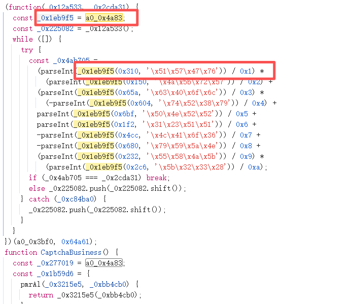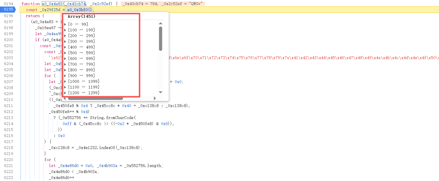 打断点进行解混淆函数内部,a0_0x4a83函数进去之后就会执行a0_0x3bf0函数返回一个大数组。
