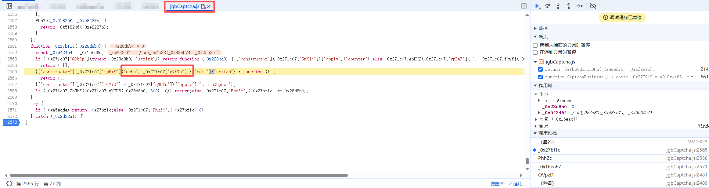 第二次而是在打开验证码jgbCaptcha.js的时候出现,可以直接删除无限debugger代码也可以去hook掉