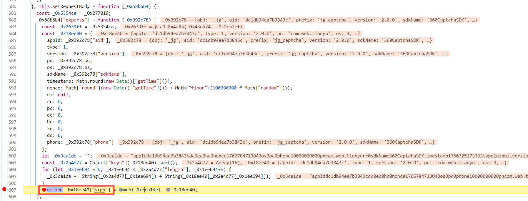1 2 3 4 5 6 7 8 9 10 11 12 13 14 15 16 17 18 19 20 21 22 23 24 25 26 27 | function sign(_0x392c78) { const _0x2639ff = _0x5354ca; const _0x18ee40 = { appId: _0x392c78["aid"], type: 1, version: _0x392c78["version"], pn: _0x392c78.pn, os: _0x392c78.os, sdkName: _0x392c78["sdkName"], timestamp: Math.round(new Date()["getTime"]()), nonce: Math["round"](new Date()["getTime"]()) + Math["floor"](100000000 * Math["random"]()), ui: null, rc: 0, pc: 0, ec: 0, hc: 0, xc: 0, dc: 0, phone: _0x392c78["phone"] }; let _0x3ca1de = ''; const _0x2a4d77 = Object["keys"](_0x18ee40).sort(); for (let _0x1ee694 = 0; _0x1ee694 < _0x2a4d77["length"]; _0x1ee694++) { _0x3ca1de += String(_0x2a4d77[_0x1ee694]) + String(_0x18ee40[_0x2a4d77[_0x1ee694]]); } return _0x18ee40["sign"] = md5(_0x3ca1de), _0x18ee40; }; |