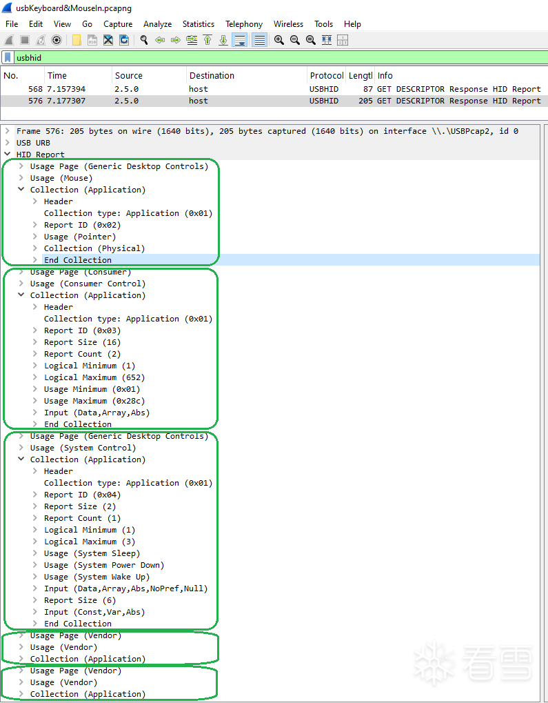 a). 按UsagePage/Usage/Collection & End Collection进行分组(绿框部分) ;