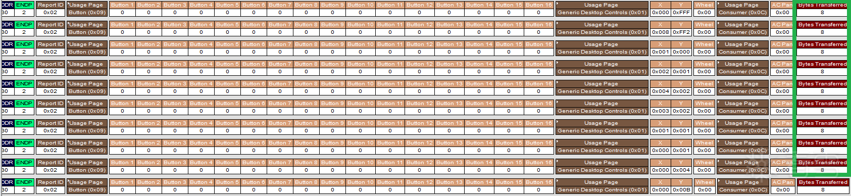 该HID Report Descriptor描述的Input Report的大小=1Byte + 16*1bit+2*12bit+1*8bit+1*8bit=8 Byte. 这个值与USB Protocol Suite捕获的USB Mouse 包的大小一致(下图中最右边绿框所示):