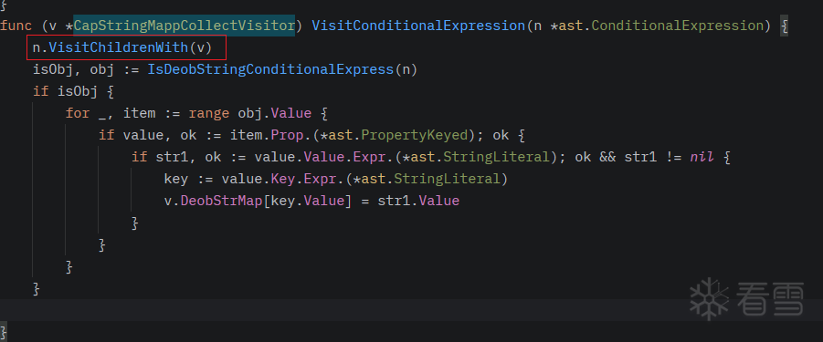 3.3.4 找到所有的需要解混淆的expression,执行DeobString并且将结果替换原节点,这里需要注意跟babel不一样,你不可以直接将节点替换,也不可以是通过函数获取 parent节点然后替换,假如在babel中直接迭代CallExpression 然后根据特征匹配到以后可以直接replaceWith 换成StringLiteral, 但这里选择了在迭代了Expression 然后匹配。